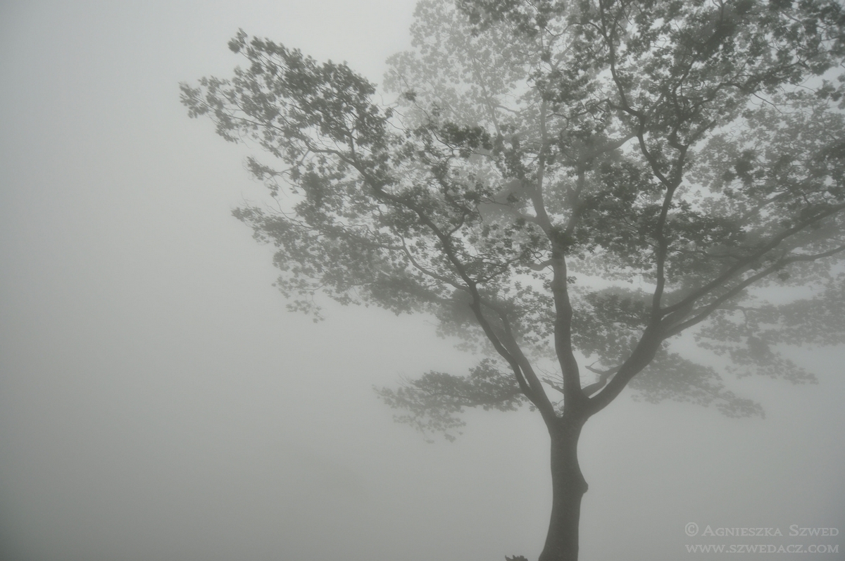 Spacerowaliśmy dość leniwie leśną ścieżką. Ciężkie chmury nadciągnęły nagle, sprawiając, że niespodziewanie zrobiło się ciemno i mgliście. W ciągu kilku chwil widoczność z doskonałej, spadła do zaledwie kilkunastu metrów. Wilgotne powietrze stało się gęste i lepkie. Miałam poczucie, jakby faktycznie oblepiało moją skórę. Byłam już w wielu lasach, ale takiego nie widziałam i nie czułam nigdy wcześniej. W pewnym momencie kolory jakby zanikły, pozostawiając tylko jaśniejsze i ciemniejsze odcienie szarości. Zupełnie, jakby świat stał się po prostu czarno biały.