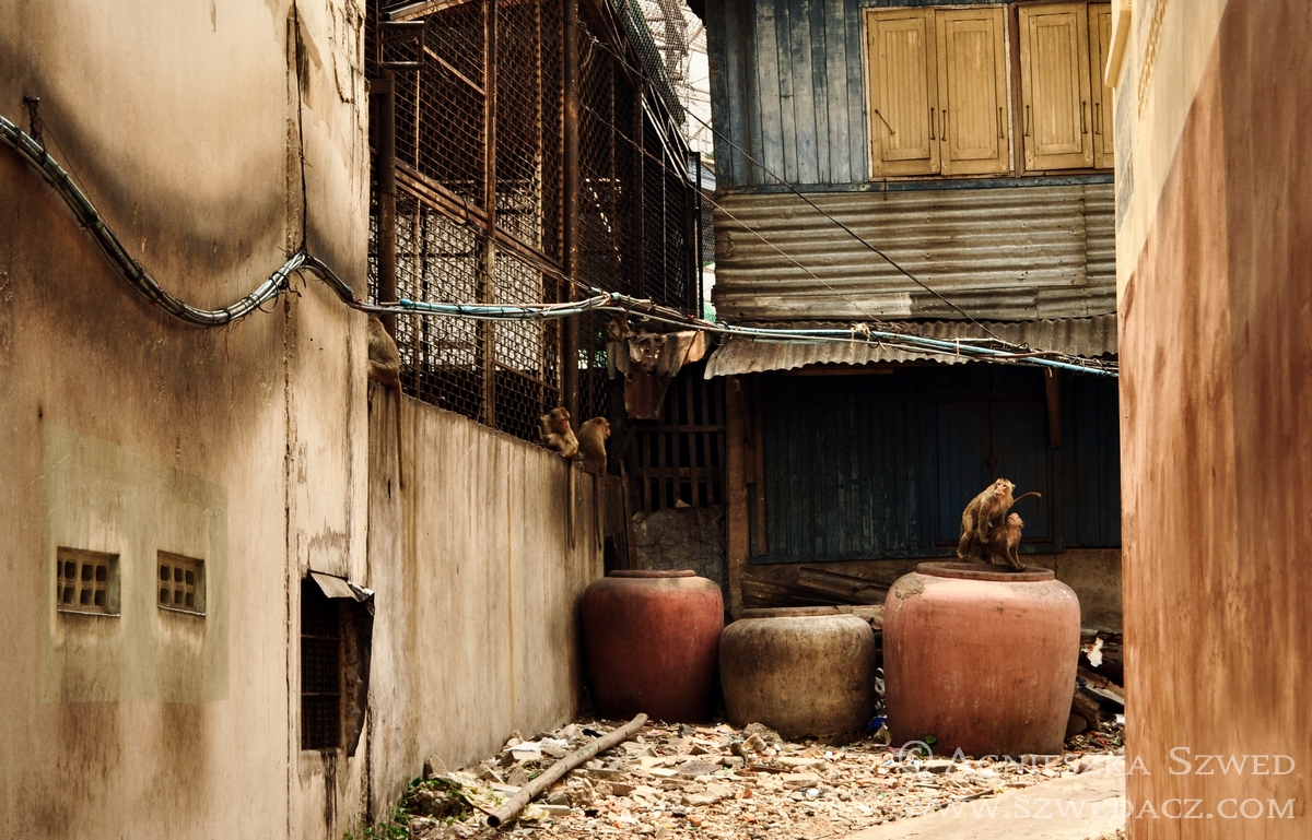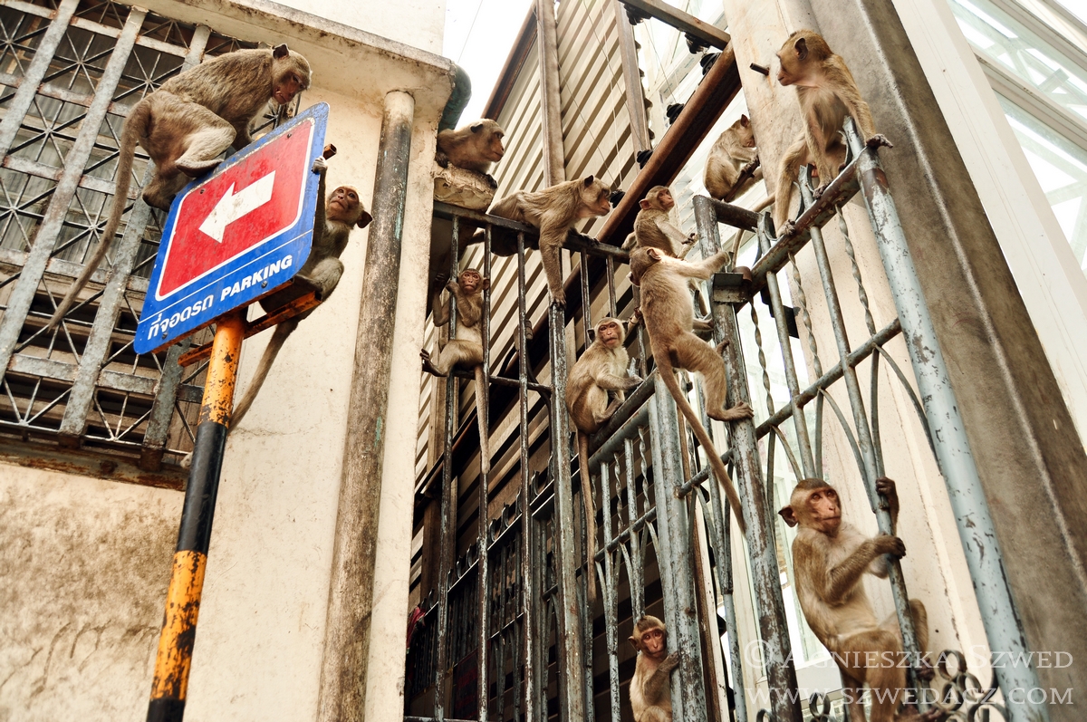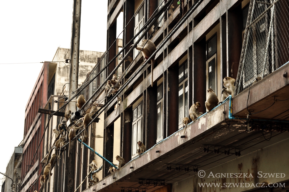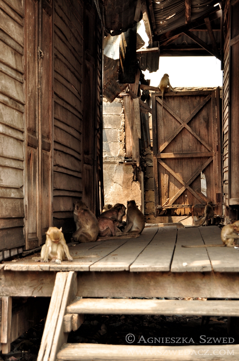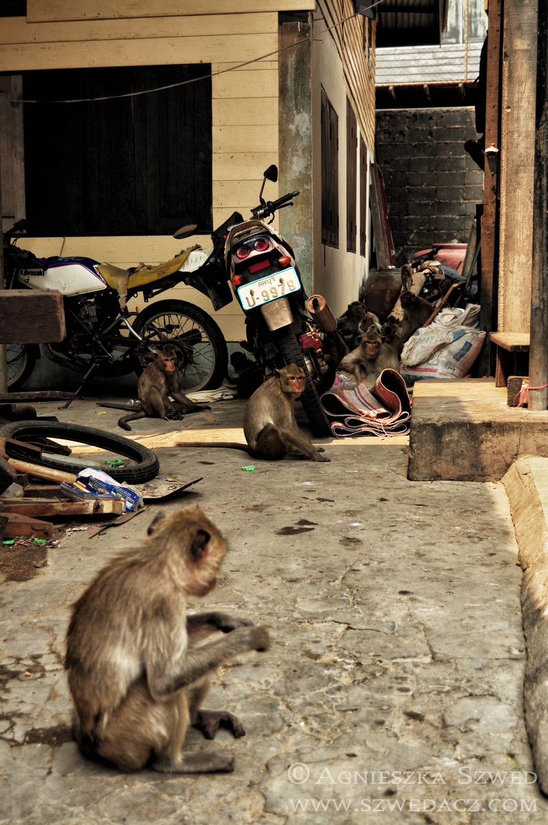 Lopburi znajduje się około 150 km na północ od Bangkoku (pokonanie tej odległości pociągiem w 2010 kosztowało odpowiednik niemal 4 zł). Tysiące makaków żyje tu nie tylko w murach świątyń (jak ma to często w tym kraju miejsce), lecz biega swobodnie po całym mieście, opanowując wiele ulic czy opuszczonych domów. Na jeden z nich mieliśmy okazję się natknąć i harmider, który stamtąd dobiegał wskazywał co najmniej na odbywającą się właśnie małpią orgię. Nie wypadało przeszkadzać, więc nie wchodziliśmy do środka. Wystarczył spacer zaułkami, będącymi również małpim królestwem.