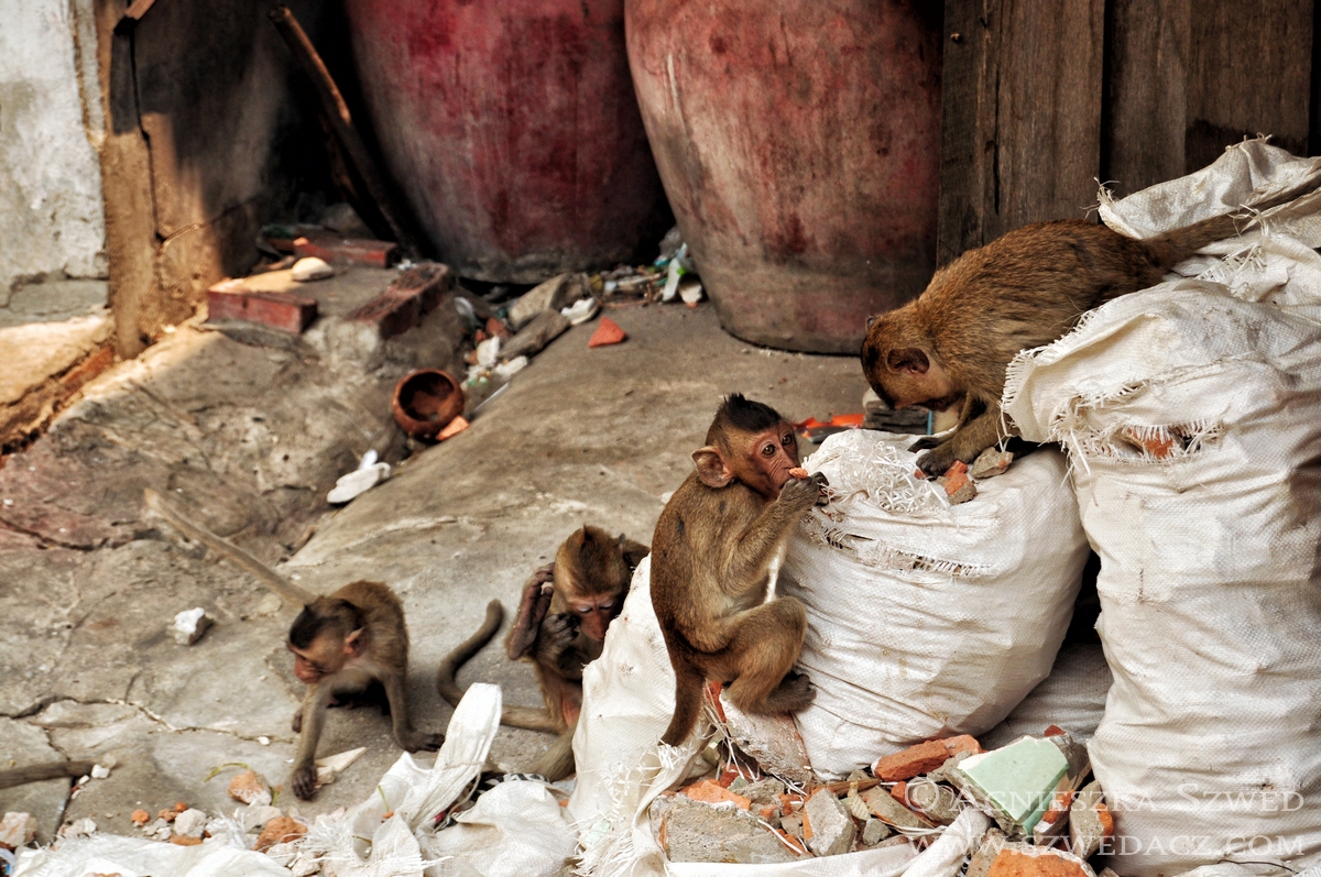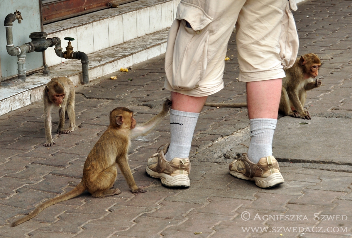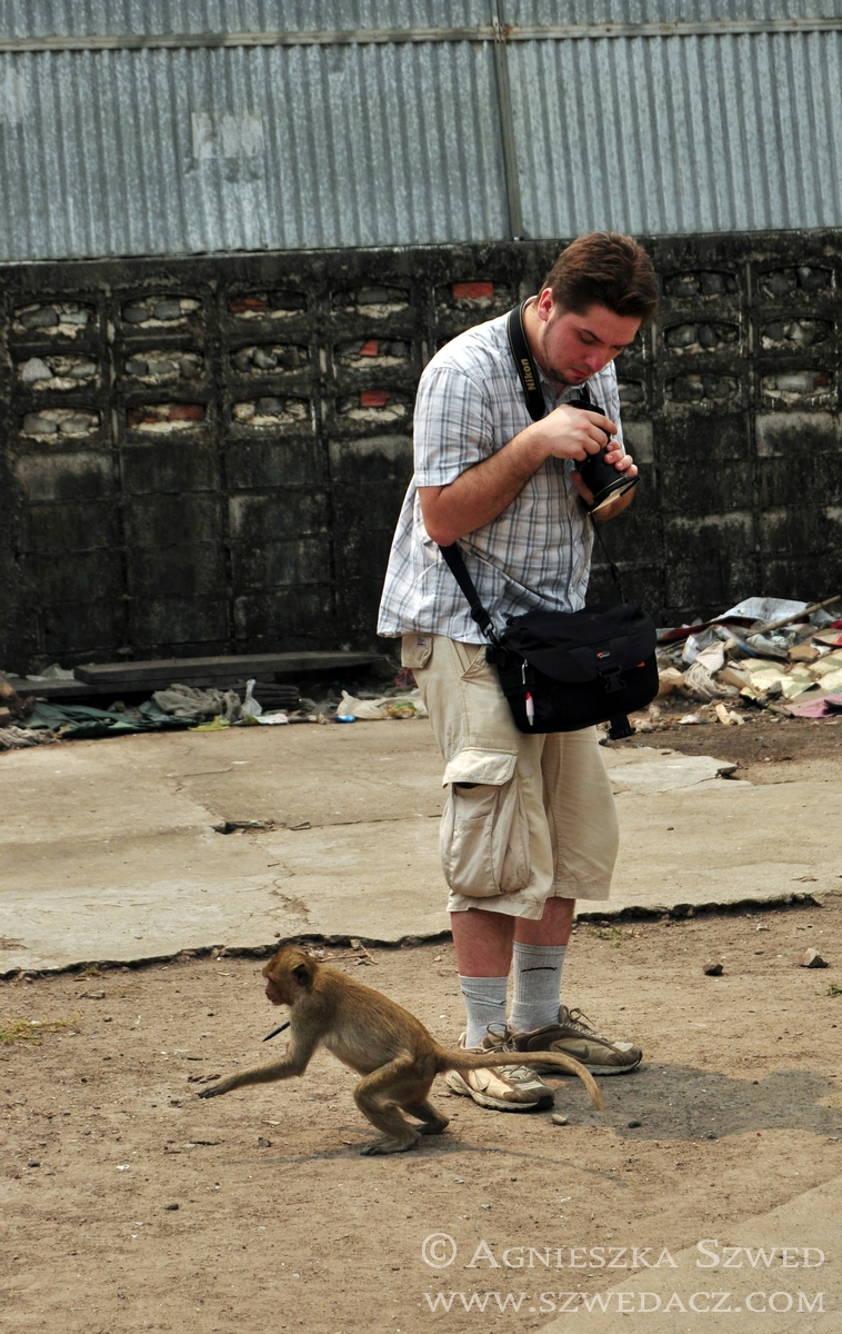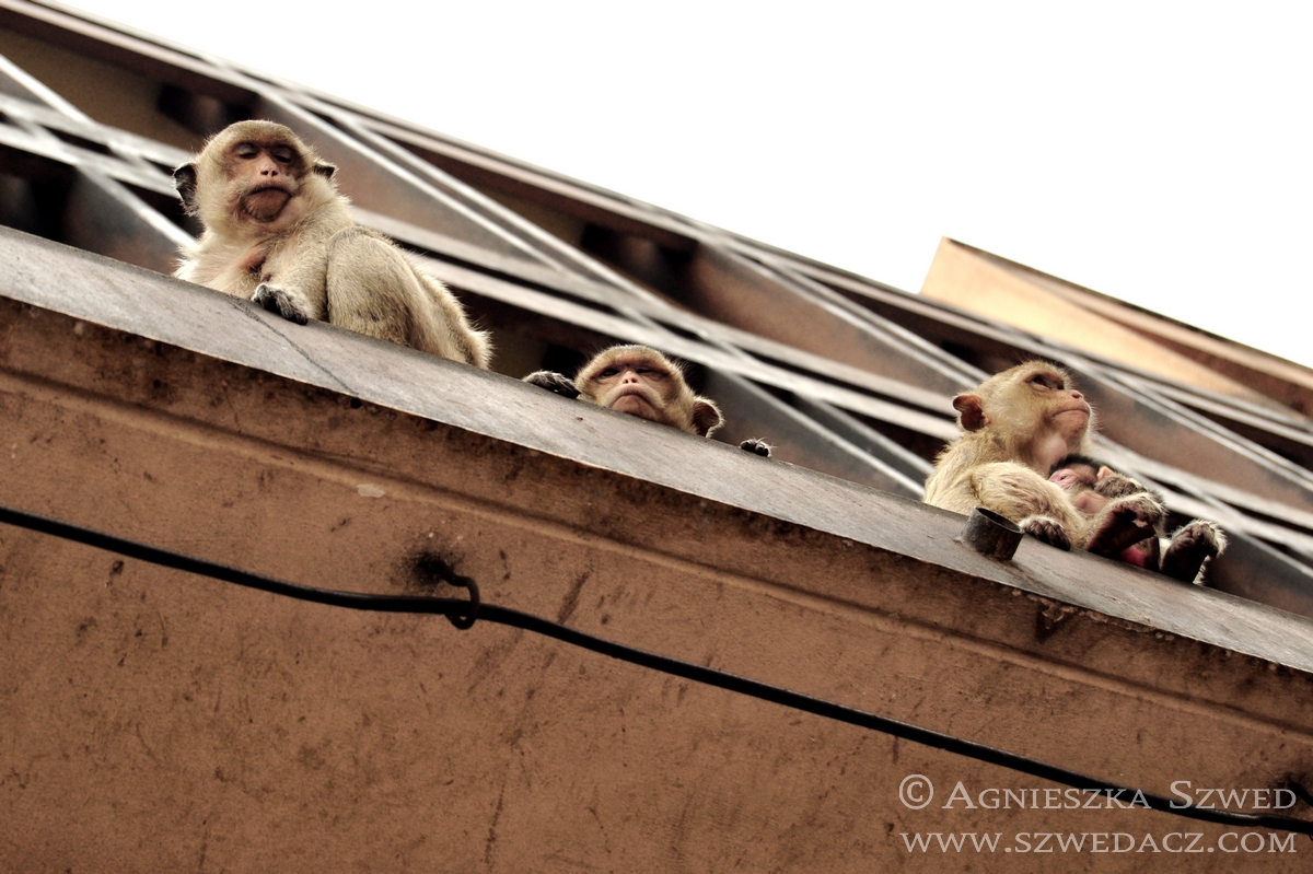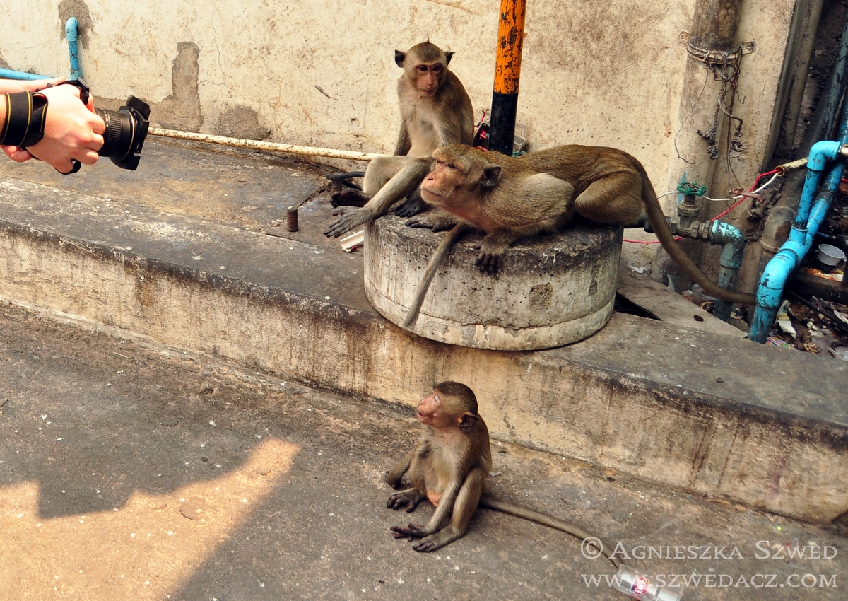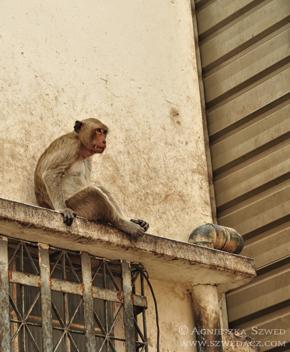 Lopburi znajduje się około 150 km na północ od Bangkoku (pokonanie tej odległości pociągiem w 2010 kosztowało odpowiednik niemal 4 zł). Tysiące makaków żyje tu nie tylko w murach świątyń (jak ma to często w tym kraju miejsce), lecz biega swobodnie po całym mieście, opanowując wiele ulic czy opuszczonych domów. Na jeden z nich mieliśmy okazję się natknąć i harmider, który stamtąd dobiegał wskazywał co najmniej na odbywającą się właśnie małpią orgię. Nie wypadało przeszkadzać, więc nie wchodziliśmy do środka. Wystarczył spacer zaułkami, będącymi również małpim królestwem.